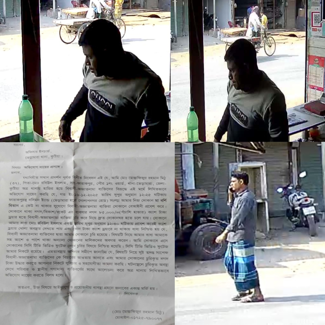 এ ঘটনায় দোকান মালিক আশপাশের ব্যবসায়ীদের অবগত করেন এবং দোকানে স্থাপিত সিসিটিভি ফুটেজ পর্যালোচনা করে চুরির প্রমাণ পান। পরে বিষয়টি নিয়ে পরিবারের সদস্য ও স্থানীয় গণ্যমান্য ব্যক্তিদের সঙ্গে আলোচনা করে ভেড়ামারা থানায় একটি লিখিত অভিযোগ দায়ের করেন।